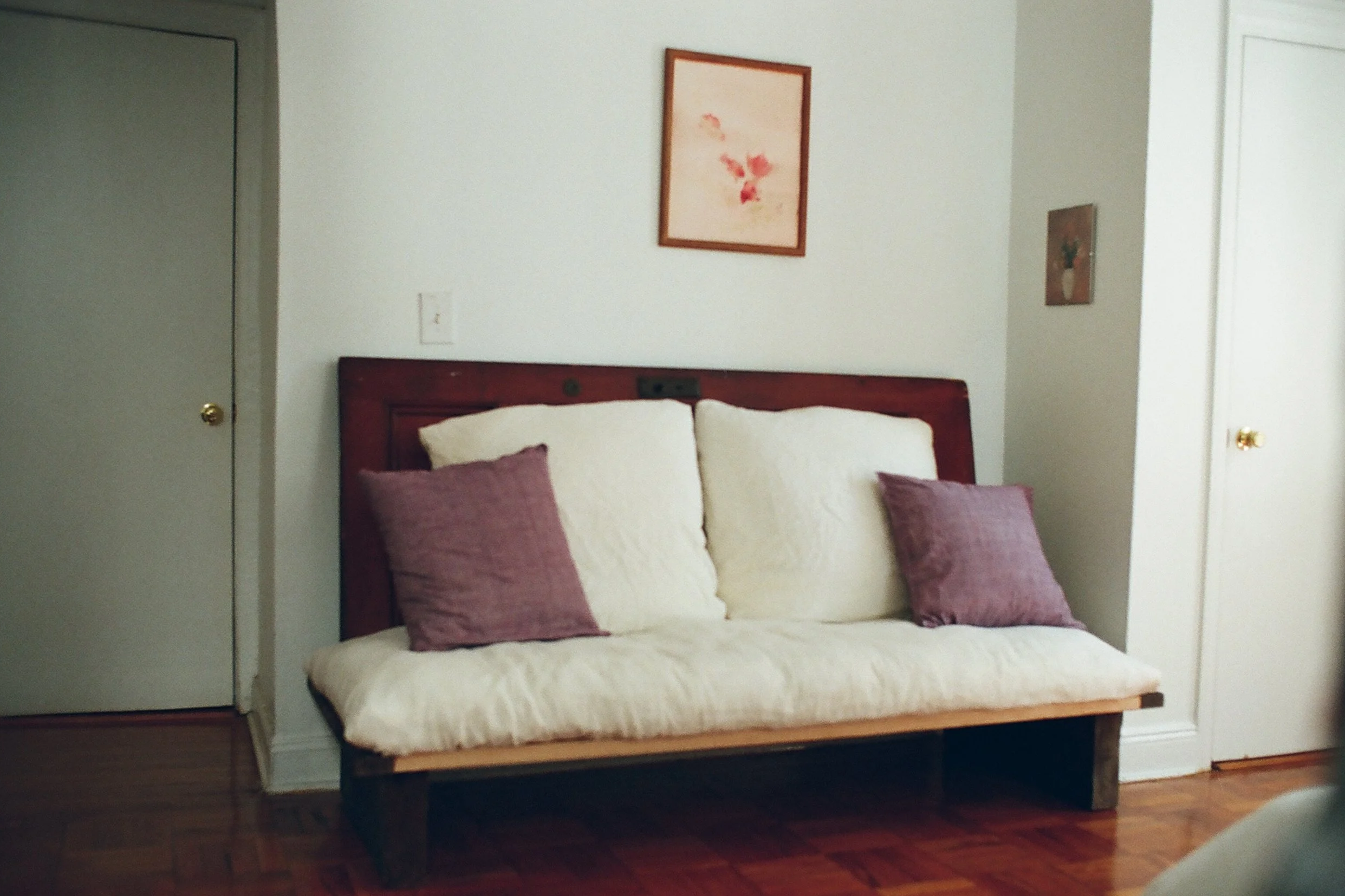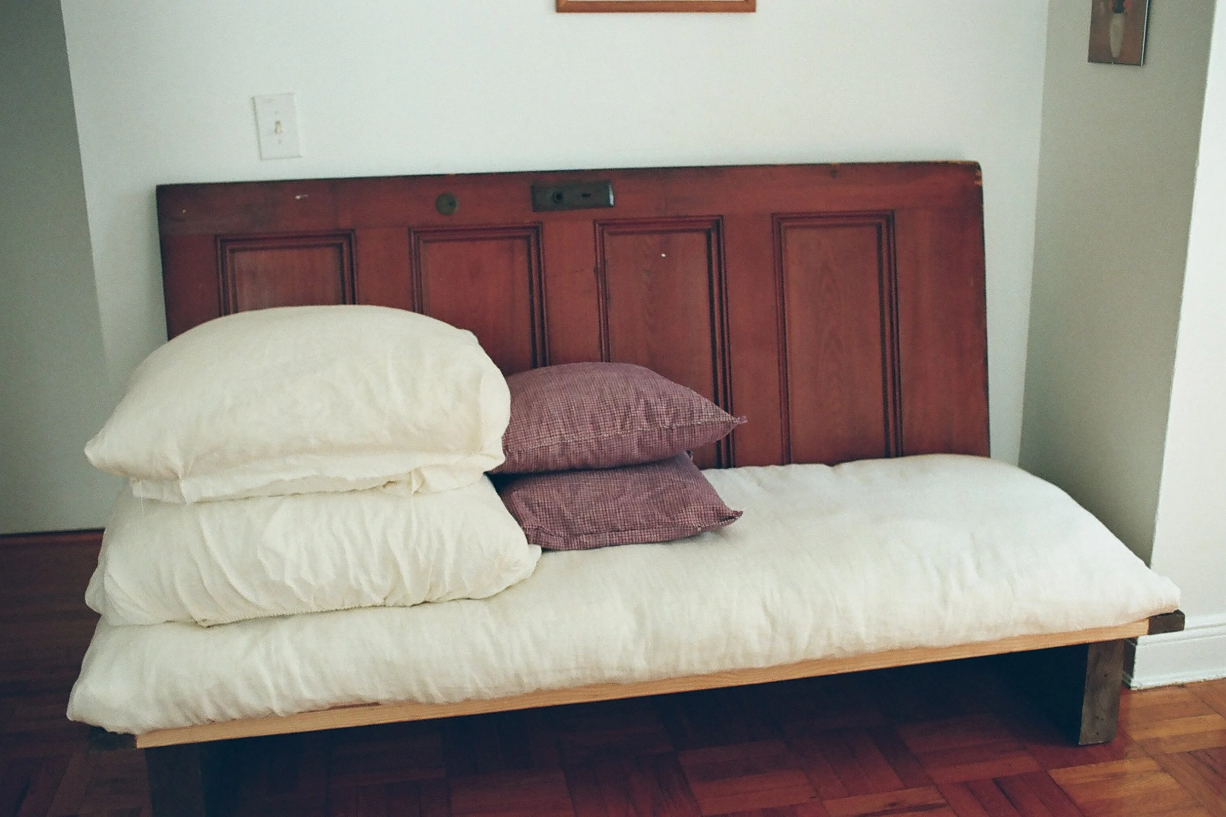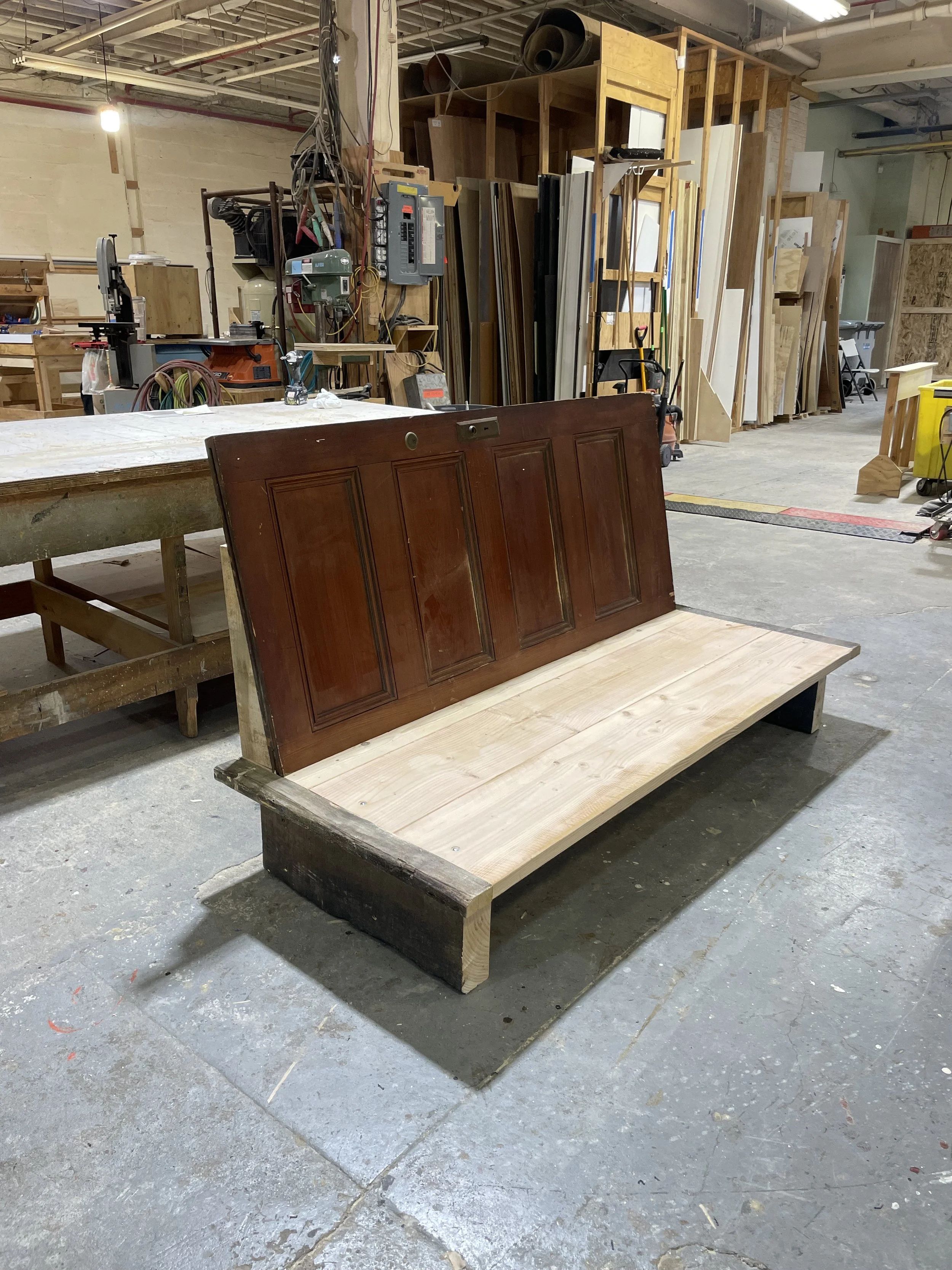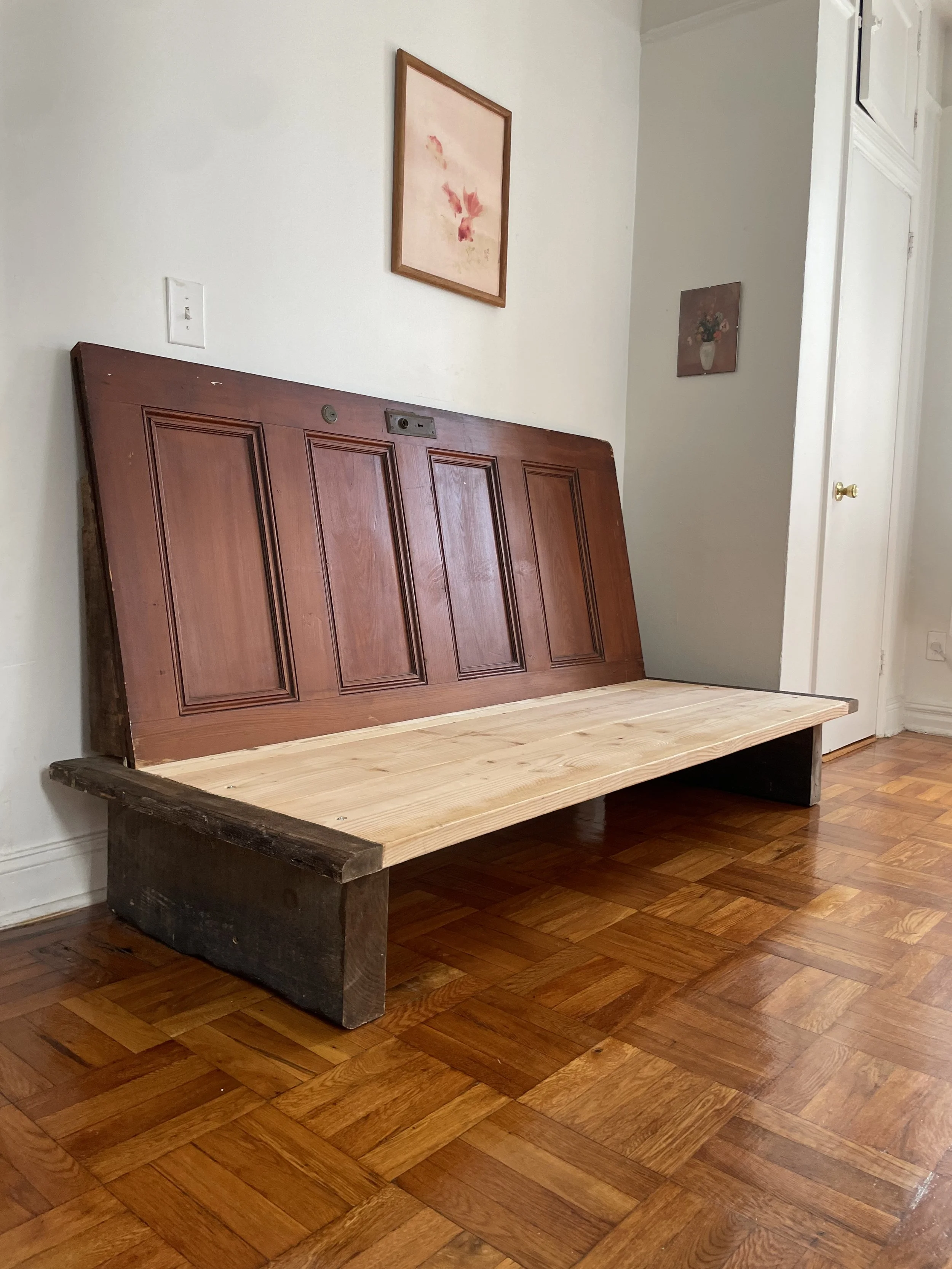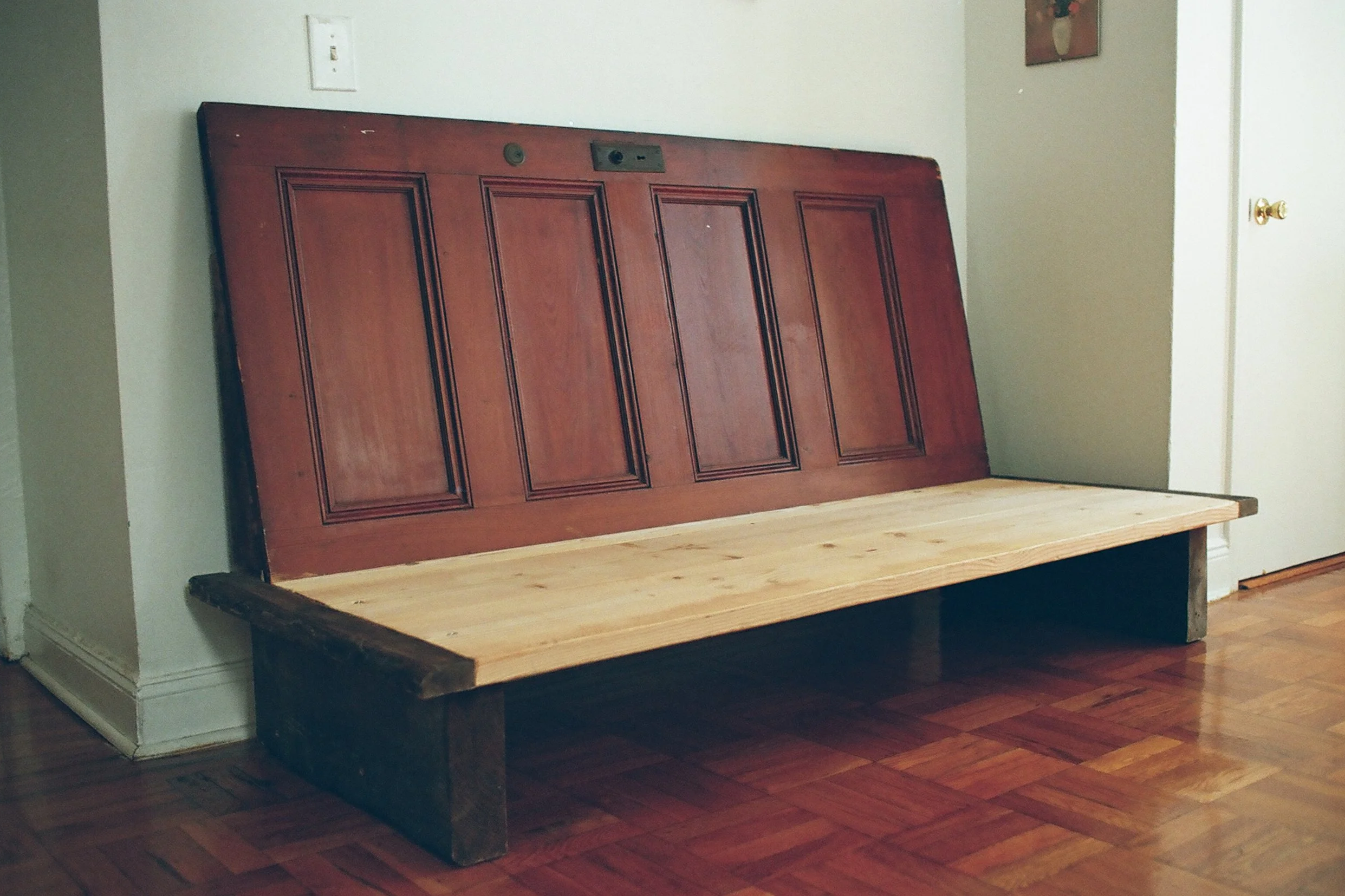 The backboard of the sofa is an antique door that was preserved from a home being renovated in New Jersey. The base of the sofa is wood from a discarded set from the movie Caught Stealing.